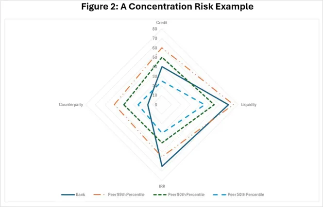 每个比率都可以与同业机构的50th、90th和99th百分位数进行比较,这些百分位数由与其特定风险类型相关联的虚线表示(见图2)。银行可以在所需的百分位数(例如,99th)上建立一个“恐惧边界”,作为跨风险类型的集中度限制。